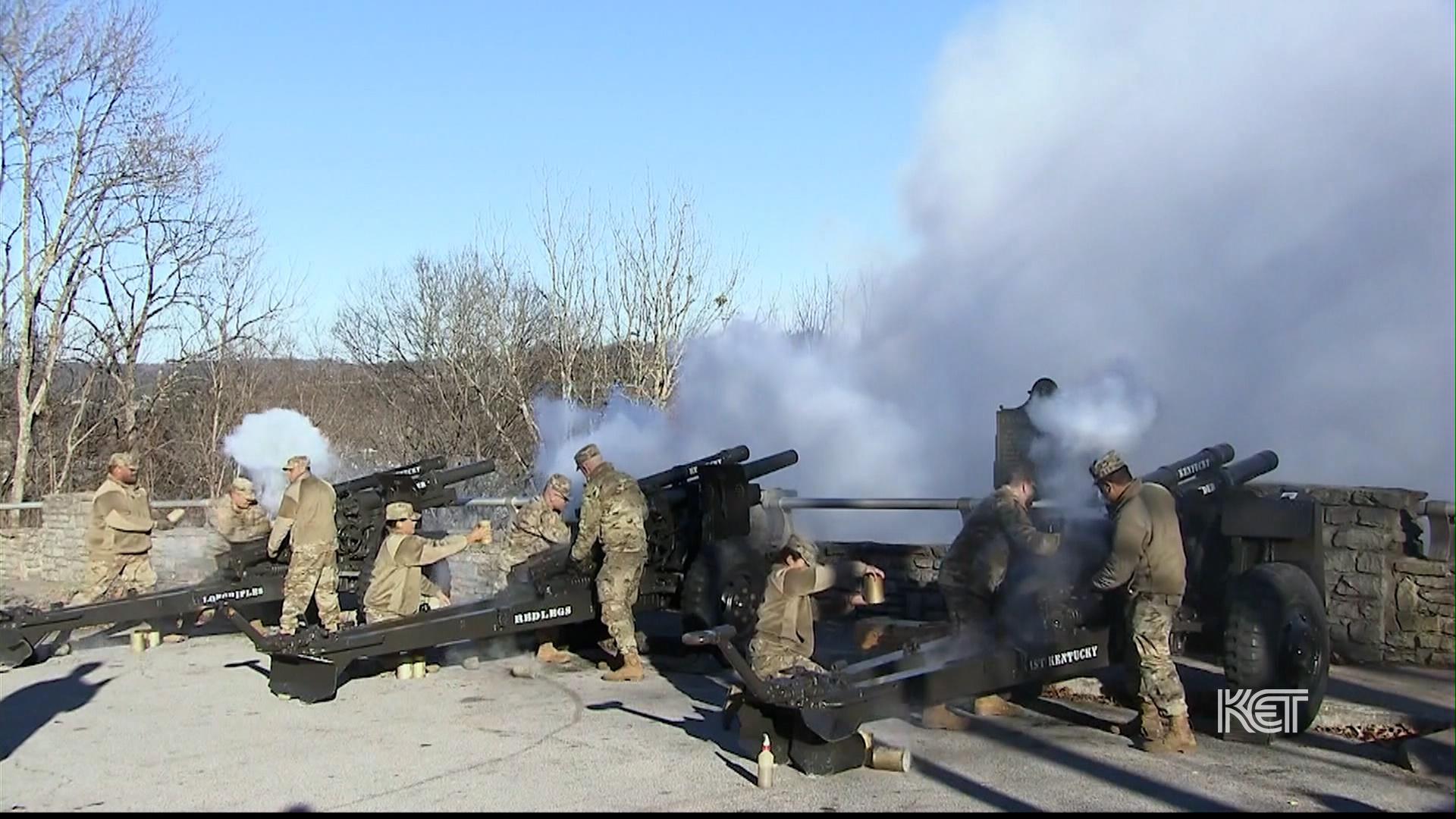 The public swearing in ceremony concluded with the Kentucky National Guard Band playing "The Stars and Stripes Forever" while other members of the Guard fired multiple rounds from three cannons positioned near the capitol.