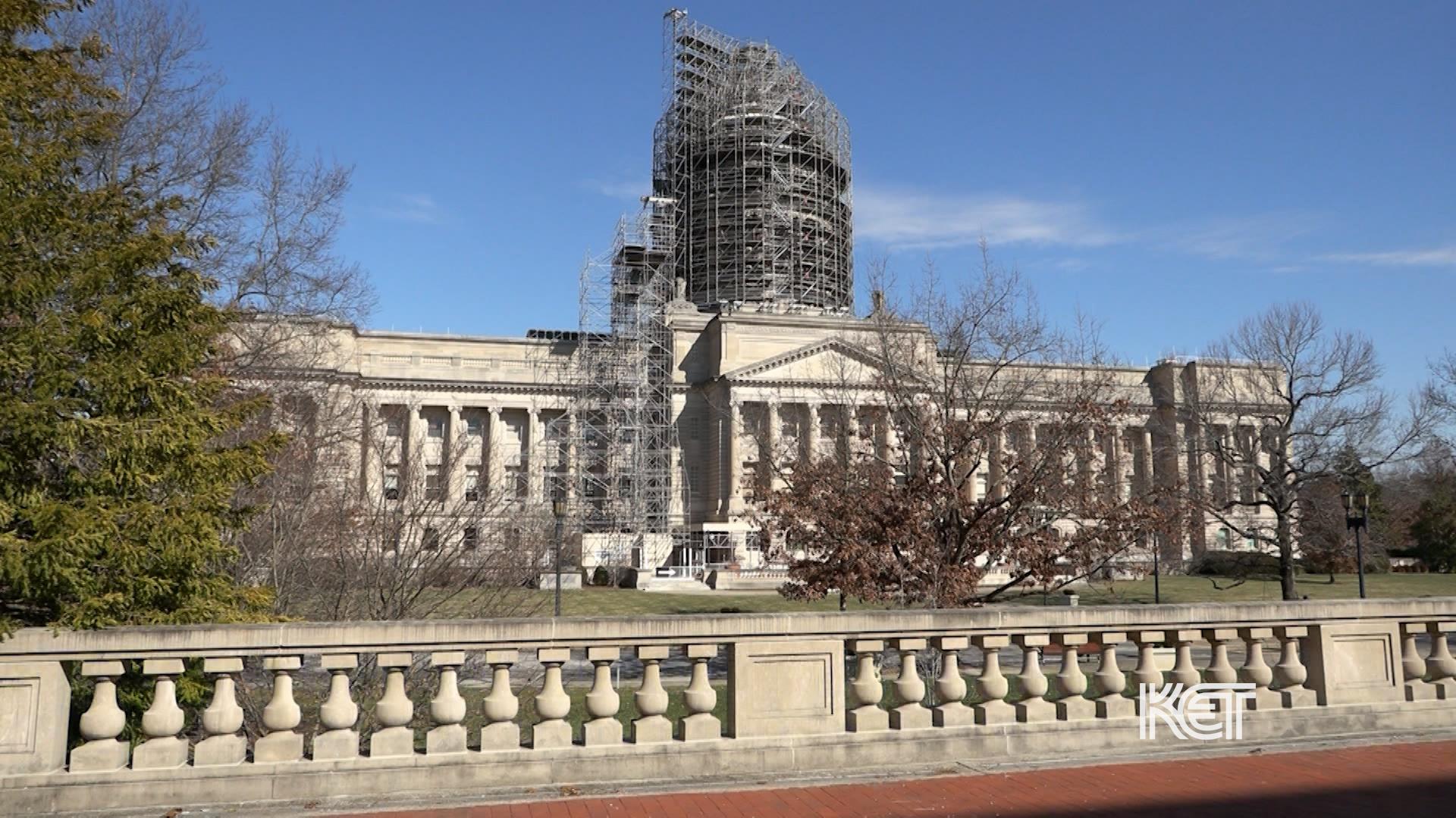The words "Kentucky Statehouse" in front of the Kentucky state capitol.
