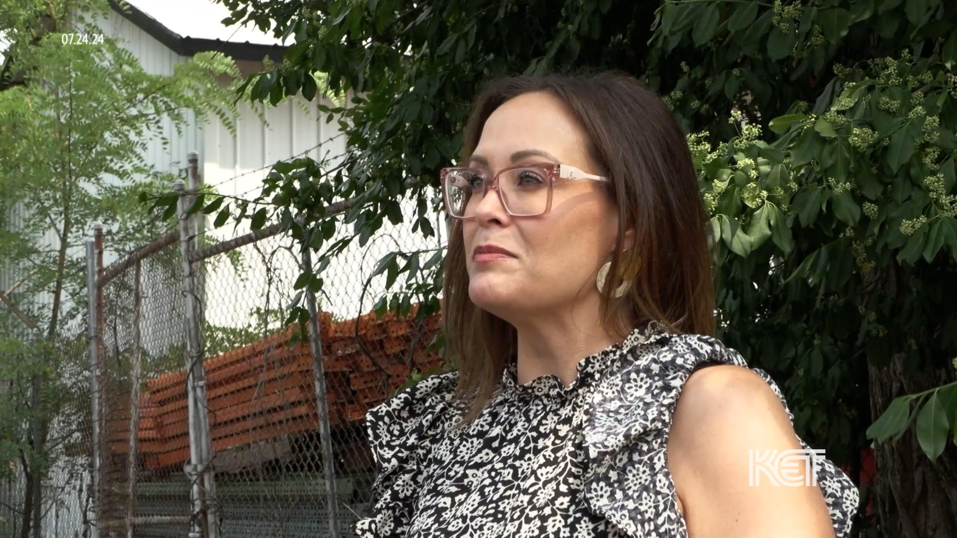 Host Renee Shaw smiling in a green dress with a KET set behind her.