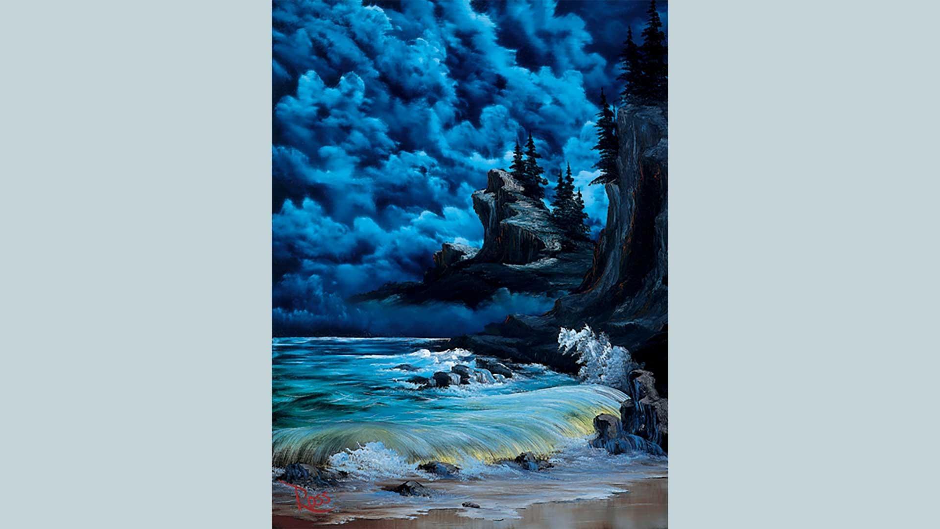 This Bob Ross masterpiece is a beautiful example of a mood-filled seascape on black canvas.
